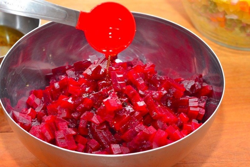 Obierz buraki, ziemniaki i marchewkę, umyj. Warzywa pokrój w kostkę. Umieść buraki w rondlu z grubym dnem. Wlej trochę oleju roślinnego i wymieszaj. Wyrównaj warstwę.