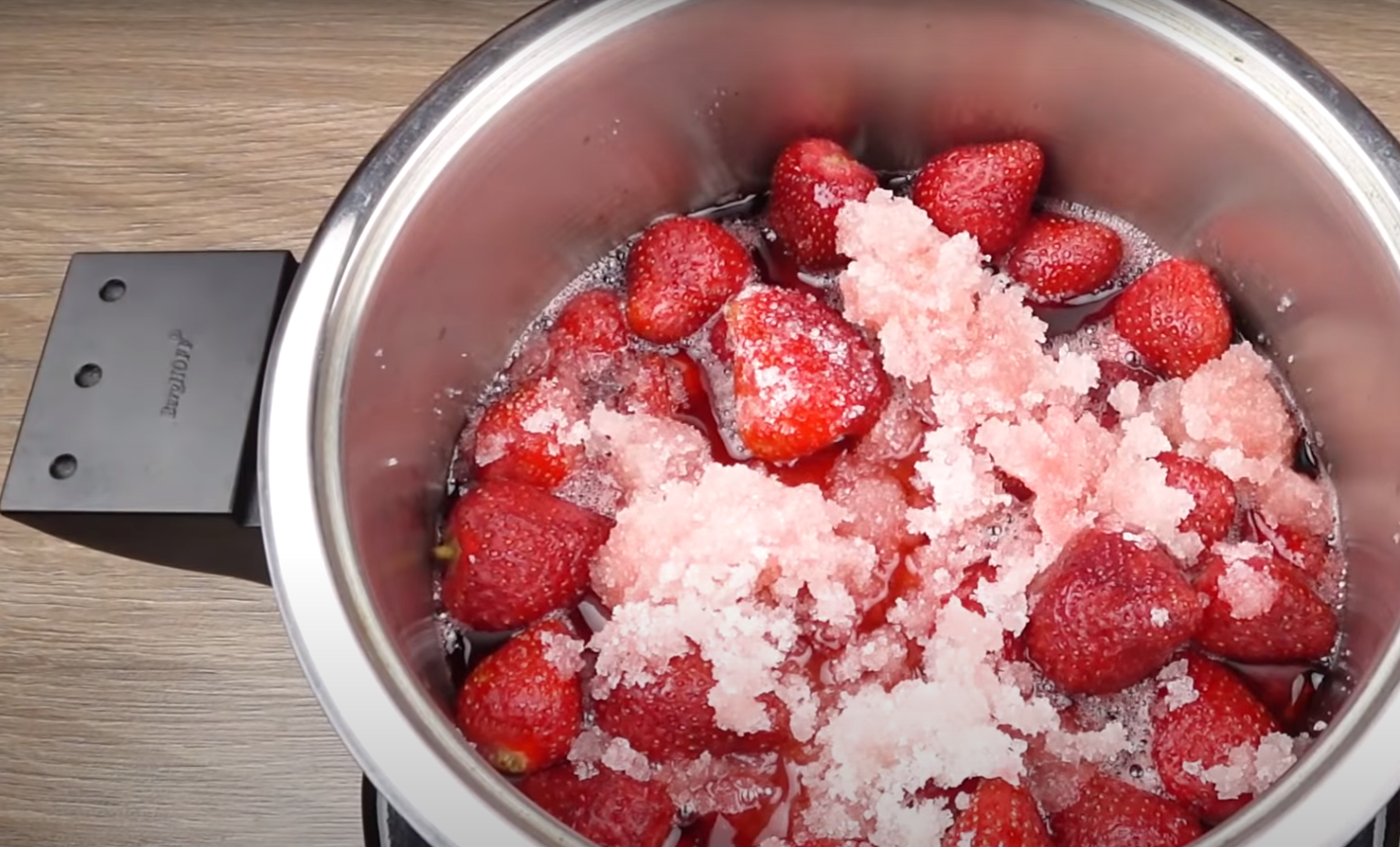 Obierz i umyj pod bieżącą wodą truskawki. Owoce zasyp cukrem. Jeśli niektóre z nich są za duże, przetnij je na pół. Pozostaw je najlepiej przykryte na około 4-7 godzin, aby uwolniły sok.