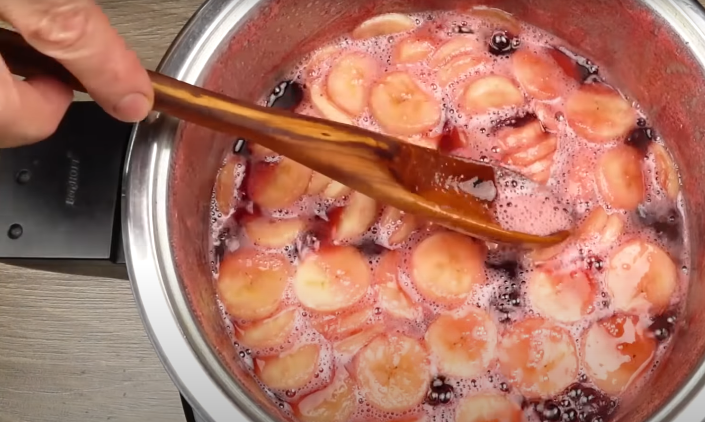 Banany obierz, pokrój w kółka. Możesz je rozetrzeć widelcem lub zostawić w plasterkach. Dodaj do truskawek i wymieszaj. Garnek z truskawkami i bananami ustaw na kuchence i gotuj przez 15-20 minut, cały czas mieszając. Ciągle usuń powstałą w trakcie piankę.