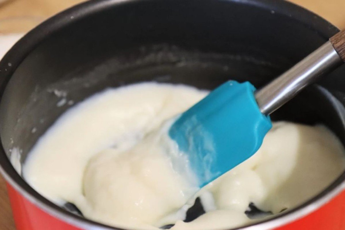 Połącz 30 g mąki i 150 ml mleka. Umieść składniki na małym ogniu. Ciągle mieszając, podgrzej mieszaninę do 65 stopni.