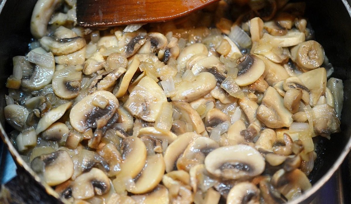 Podsmaż posiekaną cebulę na oleju i dodaj pieczarki. Gotuj 15 minut, aż lekko się zarumienią, a nadmiar płynu wyparuje. Dopraw solą i pieprzem.