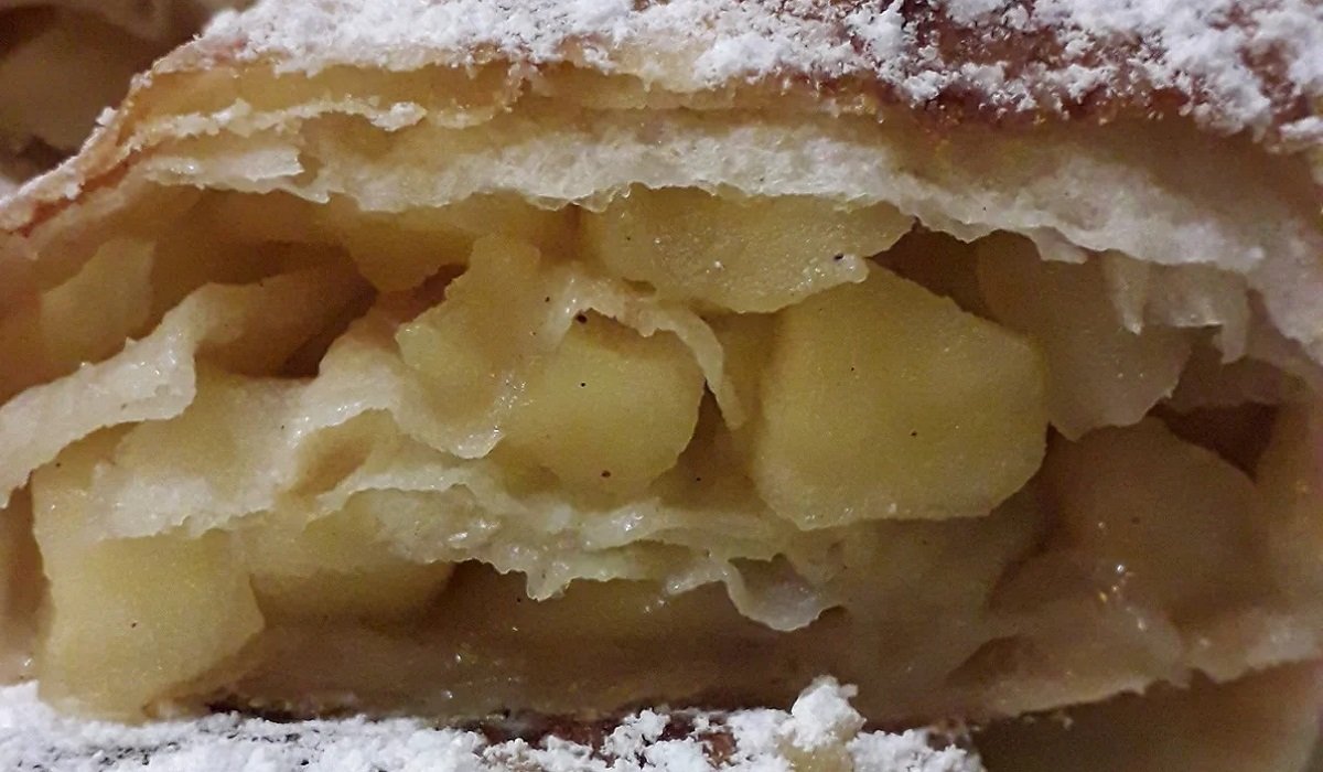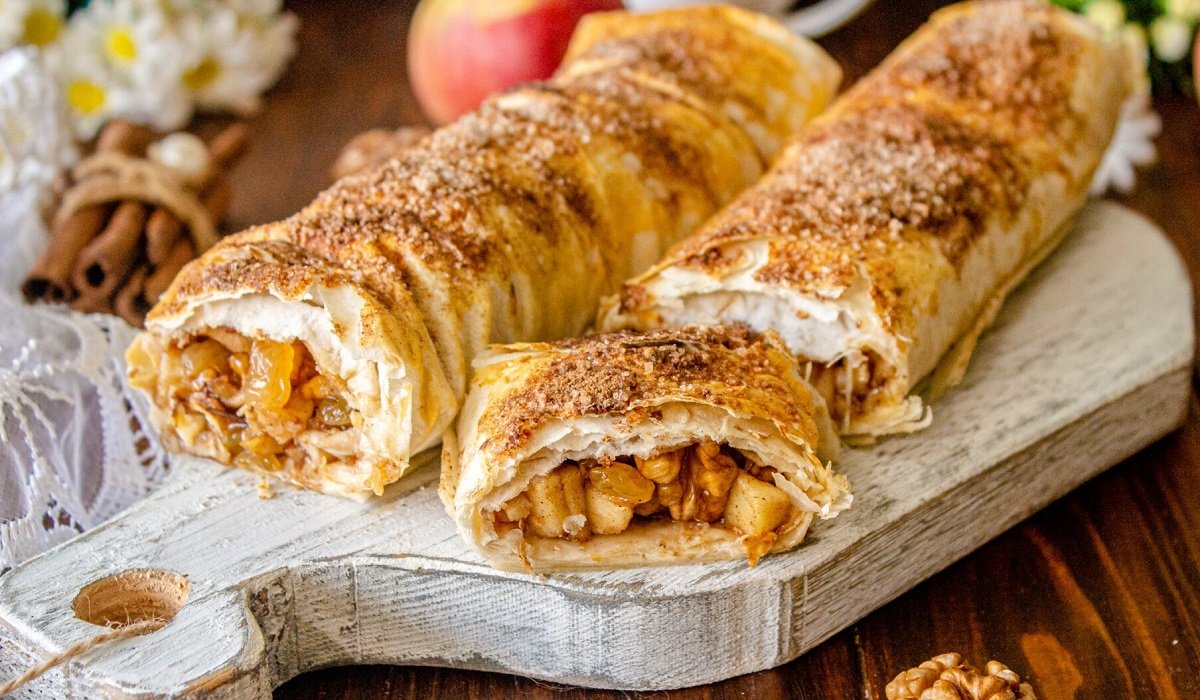 Ubij jajka ze śmietaną i wanilią. Posmaruj ta mieszanką jeden arkusz lawasz i połóż na nim drugi, ponownie posmaruj. Rozłóż trochę nadzienia i zacznij zwijać roladę. Następnie umieść strudel w naczyniu lub blasze do pieczenia. Posmaruj pozostałą mieszanką śmietany i piecz przez 30 minut w 180 stopniach.