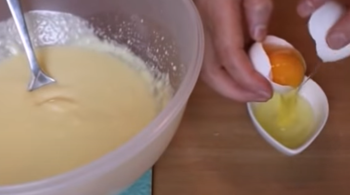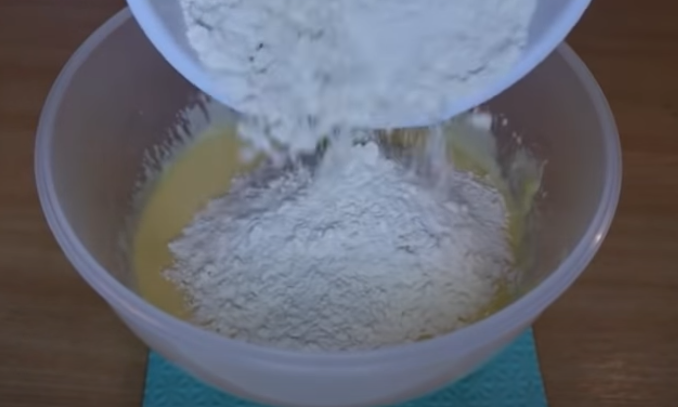 Mąkę mieszamy z solą i proszkiem do pieczenia i stopniowo dodajemy do masy.