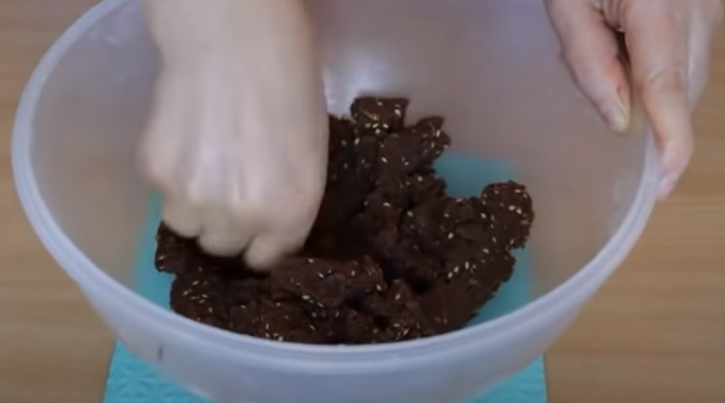 Ugniatamy gładkie, nieprzywierające ciasto, które dobrze układa się jak plastelina. Dzielimy na dwie części. Do jednej z nich wsypujemy kakao, dodajemy mleko i ugniatamy z sezamem.