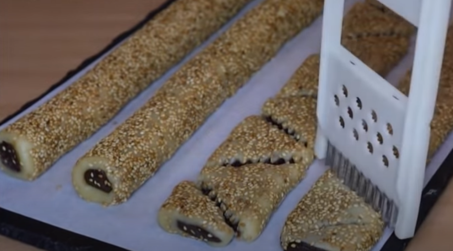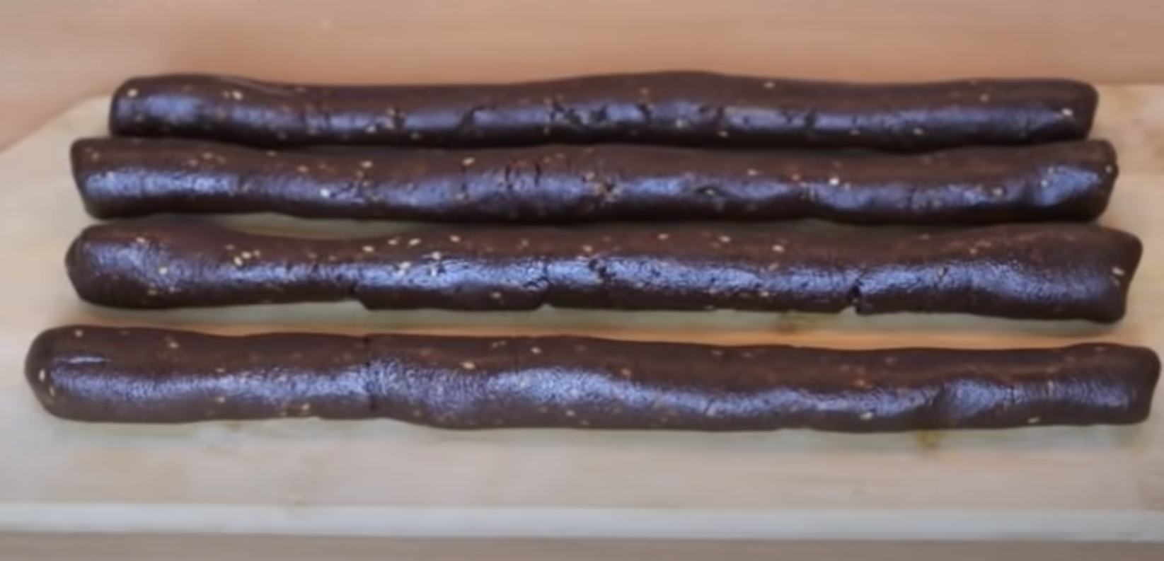 Następnie rozwałkowane ciasto obtaczamy w sezamie, delikatnie dociskamy i kroimy w trójkąty.