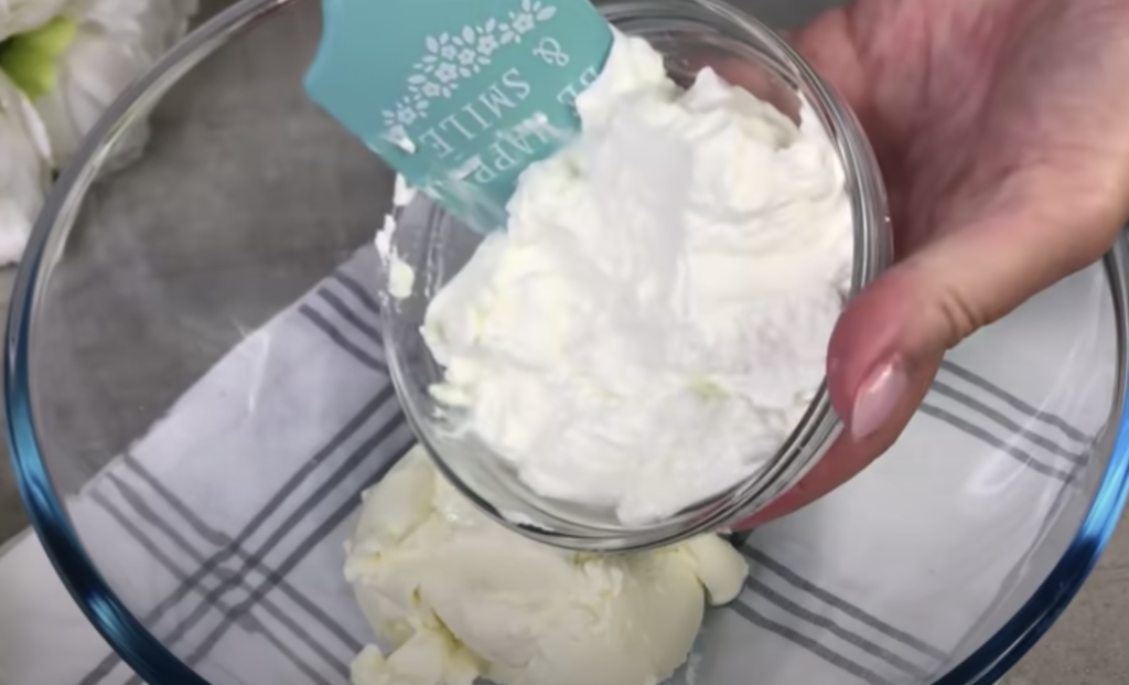 Do osobnej miski dodać mascarpone i ubić z cukrem oraz ekstraktem i dodać twarożek.