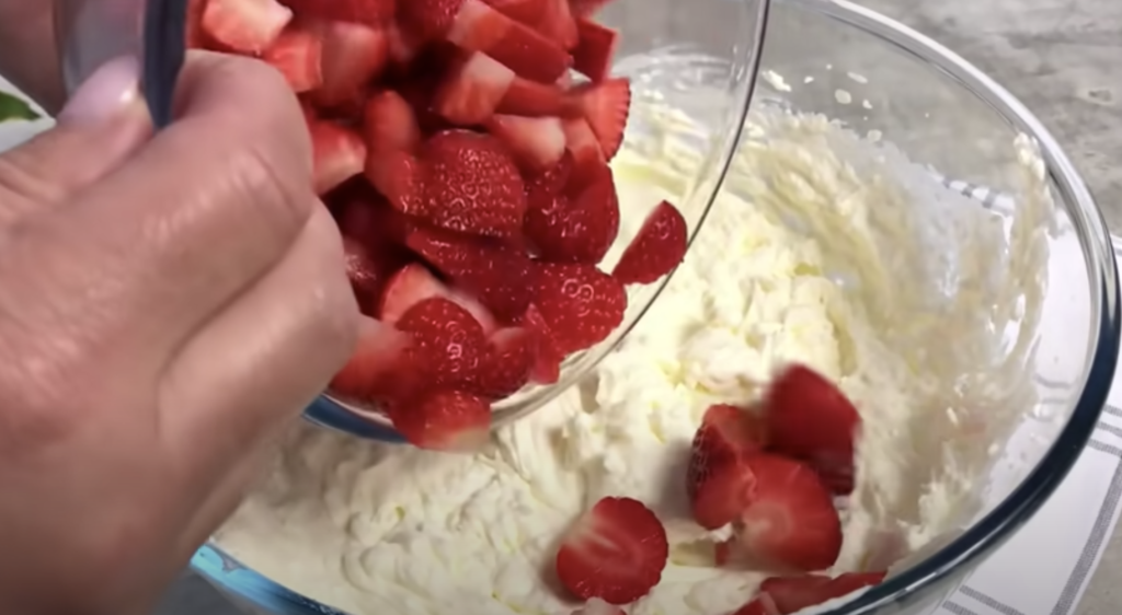 Truskawki należy pokroić na mniejsze ćwiartki i dodać do masy.