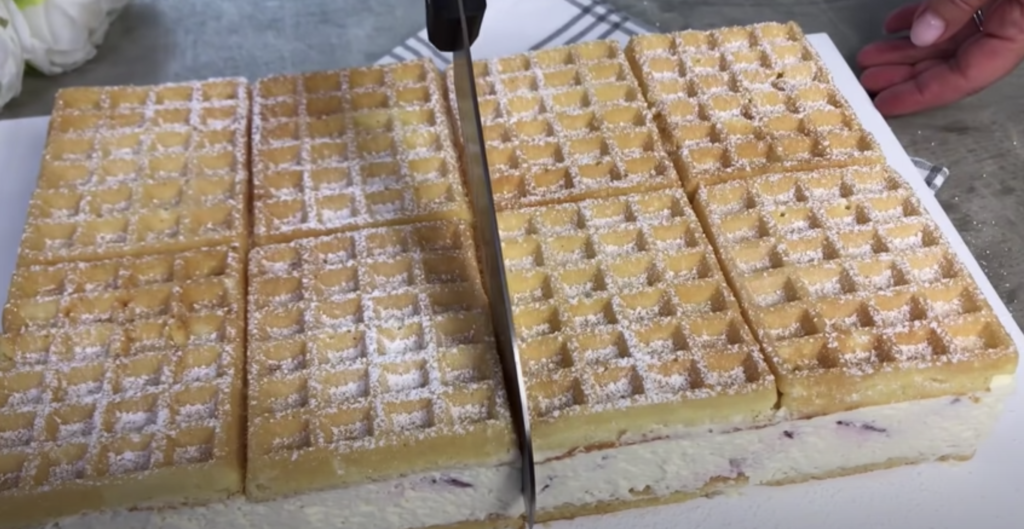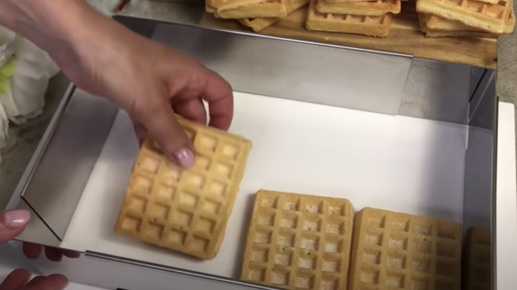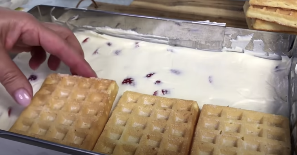Formę do pieczenia należy wyłożyć goframi i przykryć kremem, a następnie ponownie ułożyć warstwę gofrów.