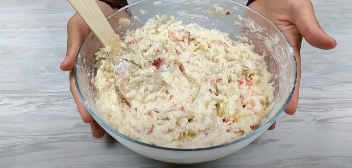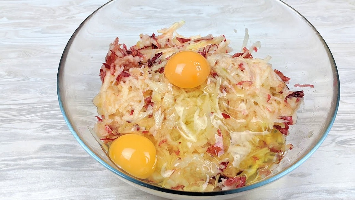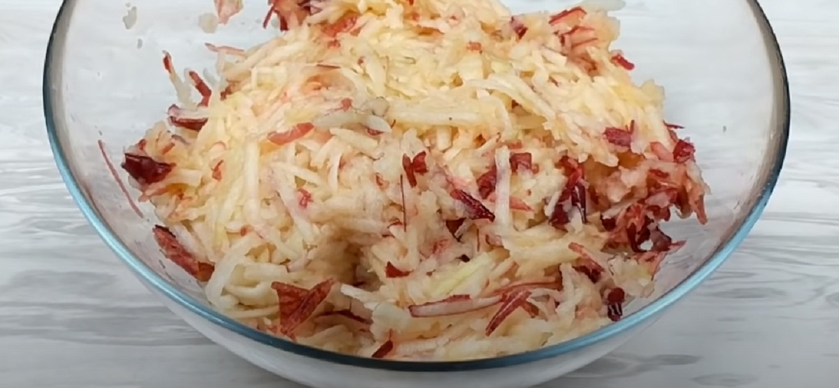 Z tego przepisu otrzymasz fantastyczny pachnący przysmak: Dodaj 2 jajka, trochę mąki i cukru do startych jabłek.