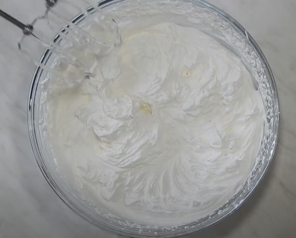 Ubijamy śmietanę. Dodaj cukier, wymieszaj. Wymieszaj jogurt bez ubijania.