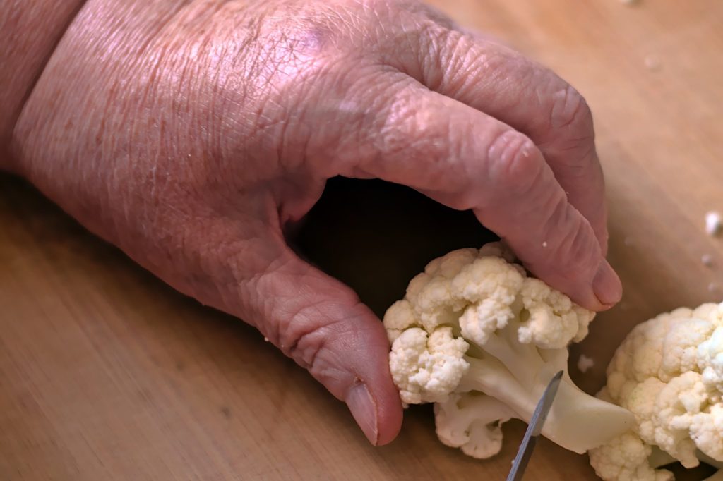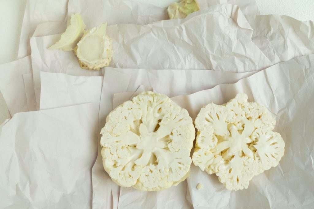 Podczas pieczenia przygotuj drugi przepis: pokrój kalafior na plasterki. Dodaj sól do gorącej wody w garnku i dodaj kalafior.