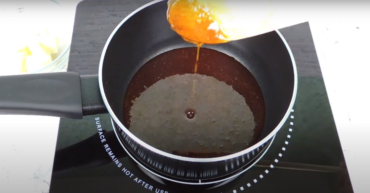 Umieść cukier na patelni lub rondlu z grubym dnem. Postaw na średnim ogniu i mieszając rozpuść cukier, aż stanie się syropem.