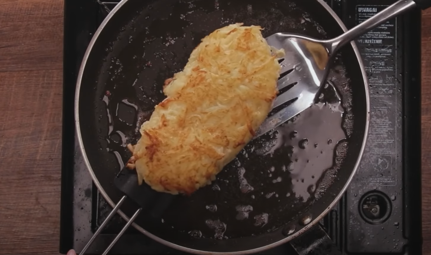 Piersi obtocz w mące, a następnie w jajkach. Ułóż je na plackach ziemniaczanych i przykryj drugą warstwą ziemniaków.