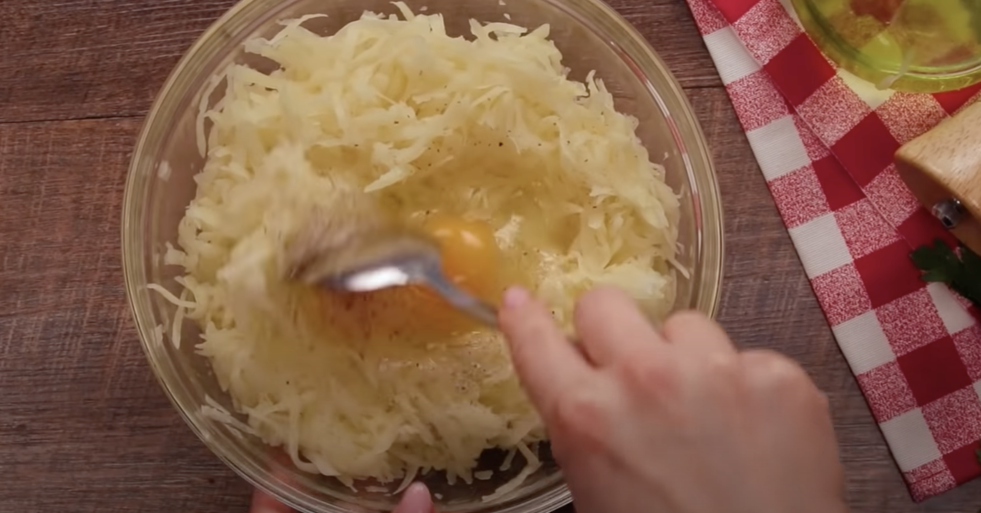 Obierz ziemniaki i zetrzyj je na tarce. Dodaj jedno jajko. Dopraw i wymieszaj.