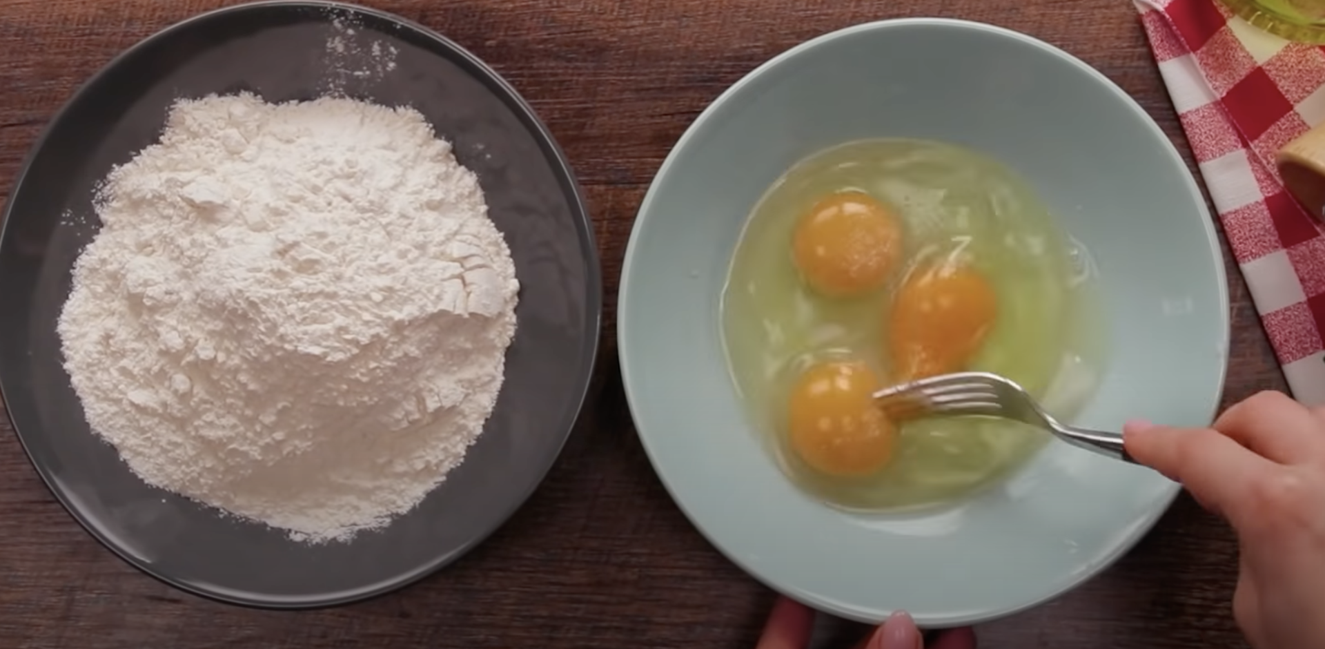 Pozostałe trzy jajka wbij do miski, posól i ubij widelcem. Do drugiej miski wsyp mąkę.