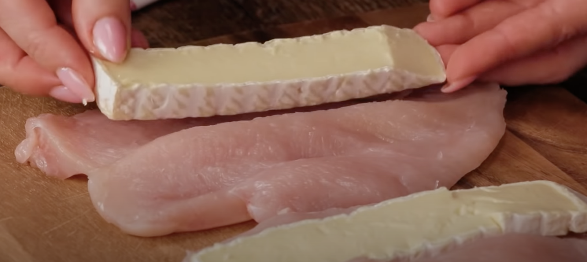 Przekrój piersi z kurczaka wzdłuż. Ser pokrój w cienkie plasterki. Połóż go na mięsie i ułóż drugi kawałek mięsa na górze.