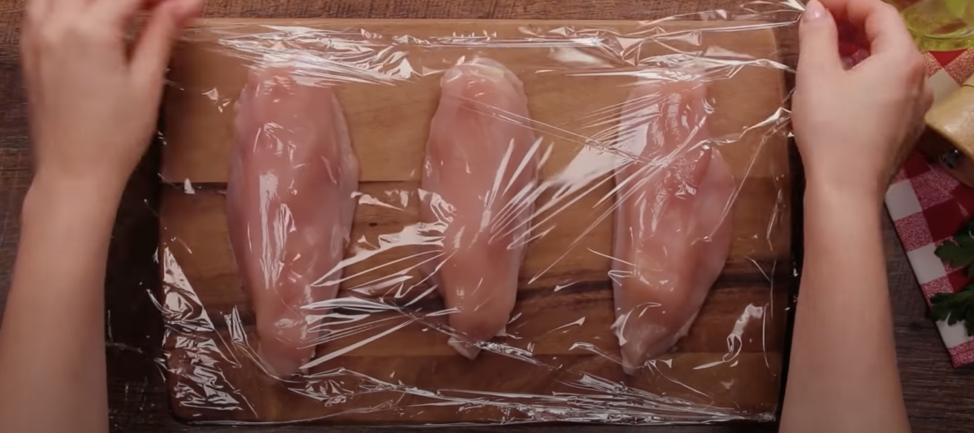 Następnie przykryj kawałki kurczaka folią spożywczą. Rozbij mięso tłuczkiem.