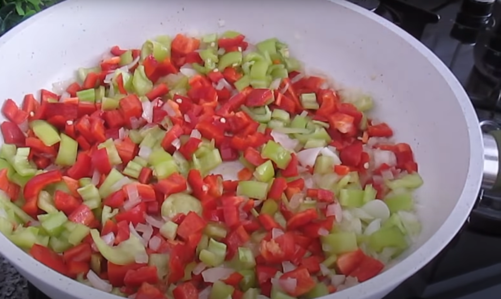 Umyj paprykę , oczyść i pokrój w kostkę. Z pomidorów zdejmij skórkę i także pokrój w kostkę. Cebulę umyj i drobno pokrój. Na patelnię wlej oliwę, podgrzej i podsmaż cebulę przez około 1 minutę.