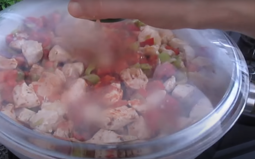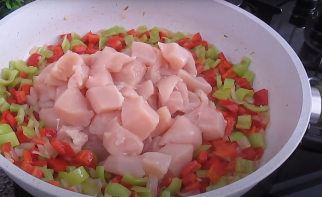 W międzyczasie pokrój pierś z kurczaka na małe kawałki, a następnie dodaj do warzyw. Smaż aż mięso będzie miało biały kolor.