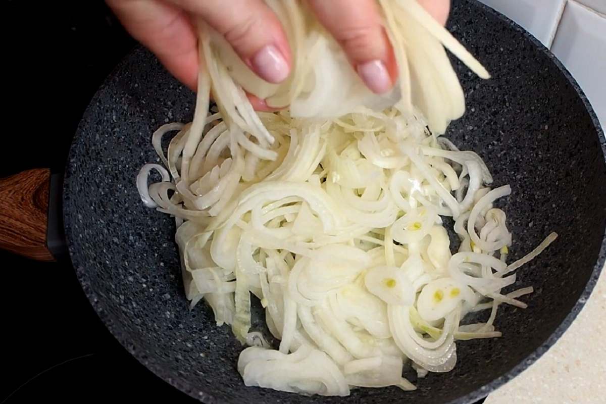 Cebulę obierz i pokrój w drobną kostkę lub półpierścienie. Rozgrzej olej roślinny na patelni i podsmaż cebulę.
