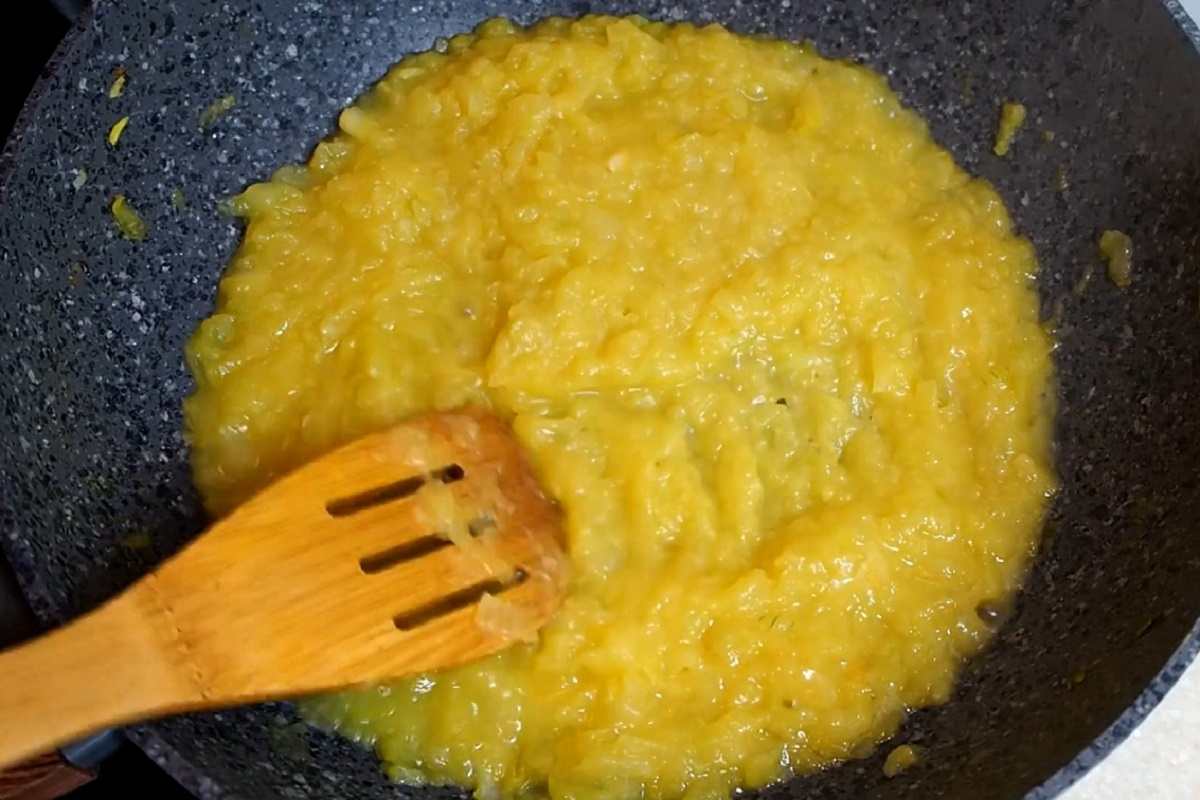 Do cebuli dodaj sodę oczyszczoną, zmniejsz ogień i smaż, aż cebula będzie miękka i rozpadnie się na małe kawałki – możesz przyspieszyć ten proces pomagając sobie blenderem ręcznym.