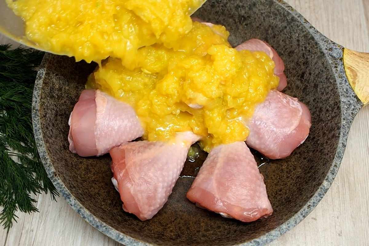 Wlej trochę oleju roślinnego na osobną patelnię, ułóż udka z kurczaka i polej sosem cebulowym. Duś na średnim ogniu pod przykryciem około 20 minut.