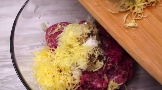 Do wygodnej miski, przełóż mielone mięso. Cebulkę dymkę oraz dwa ząbki czosnku, drobno posiekaj i dodaj do mięsa. Teraz dodaj starty na tarce o grubych oczkach ser, dopraw solą i pieprzem do smaku. Dobrze wszystko wymieszaj.