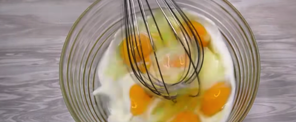 Do osobnej miski, wbij jajka, wlej mleko, dopraw solą i wymieszaj wszystko trzepaczką.