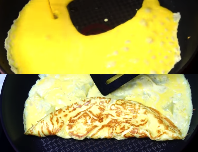 Smaż naleśniki na rozgrzanej patelni z olejem, ale tylko z jednej strony na złoty kolor. Z uzyskanej masy, powinno Ci wyjść 5 naleśników.
