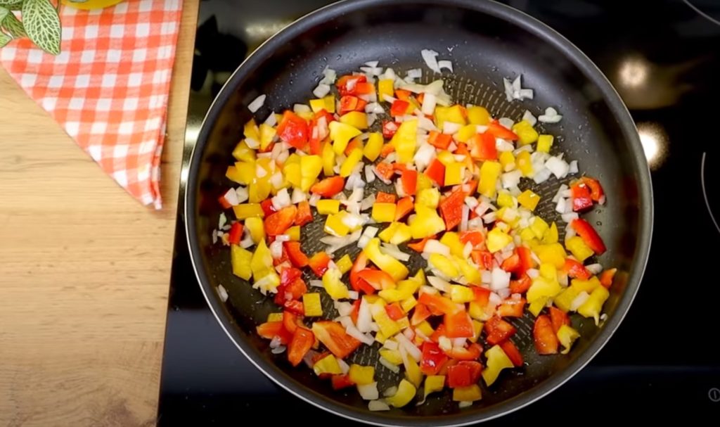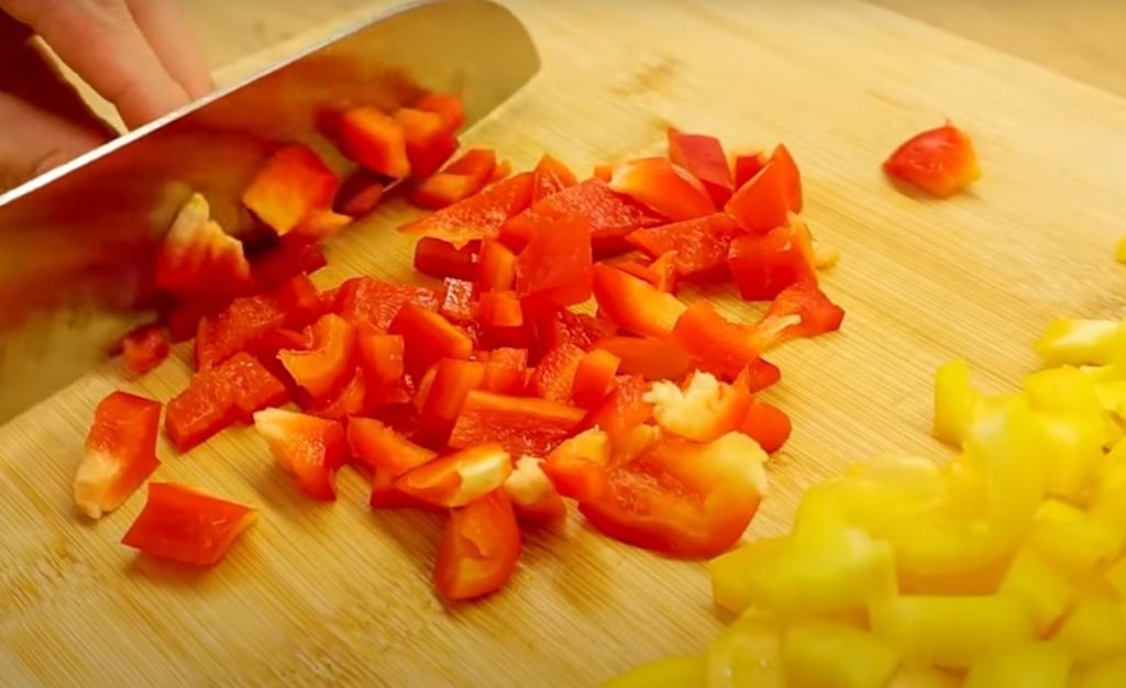 Drobno posiekaj cebulę, oczyść paprykę i pokrój na małe kawałki.