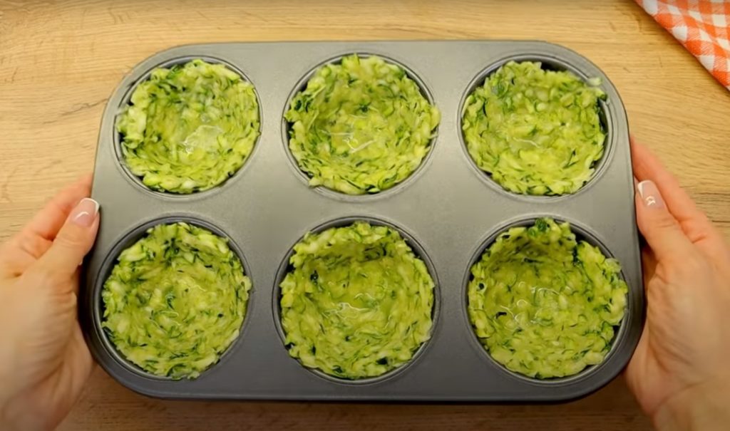 Nasmaruj foremkę na muffinki olejem i ułóż mieszankę z cukinii. Za pomocą łyżki dociśnij, aby powstały babeczki z cukinii.
