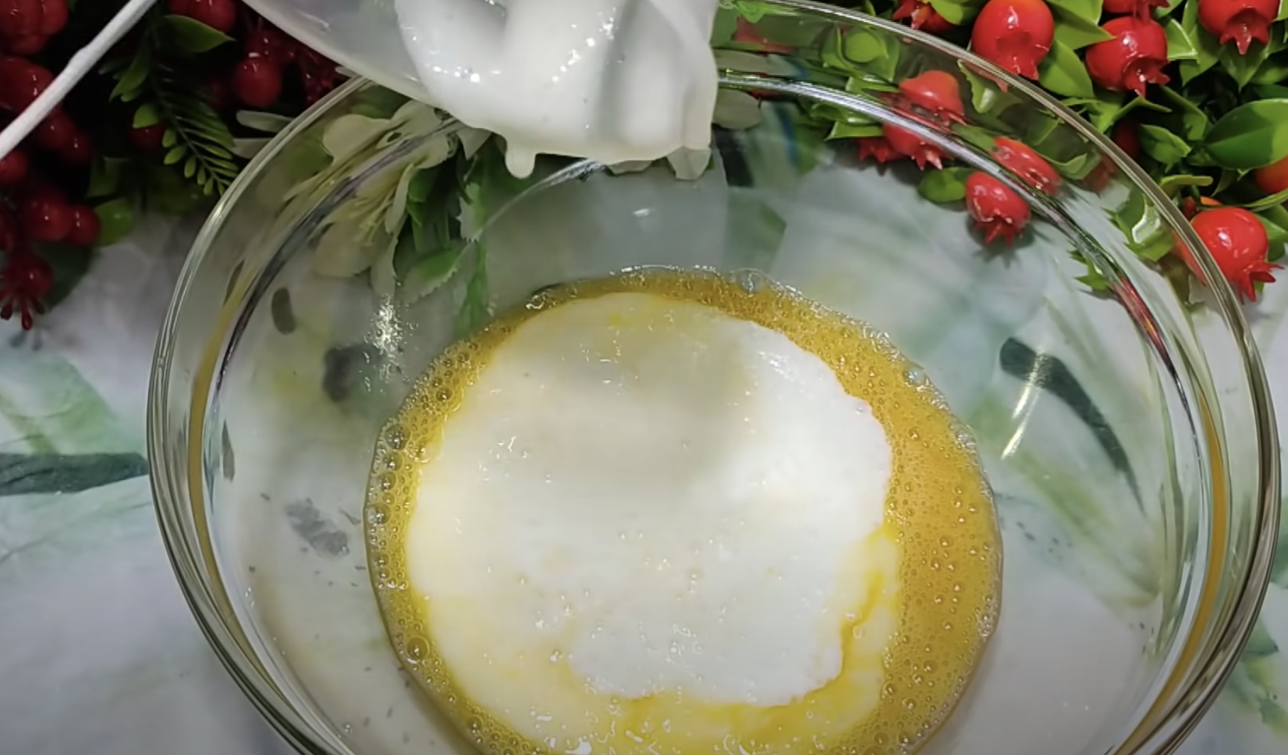 Dodaj mieszaninę kefiru, wlej olej.