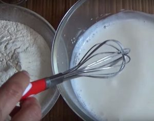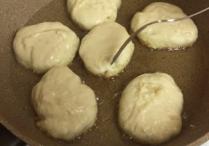 Stopniowo dodawaj przesianą mąkę i zagniataj ciasto. Pozwól ciastu odpocząć przez około 5 minut. Następnie rozgrzej olej na patelni.