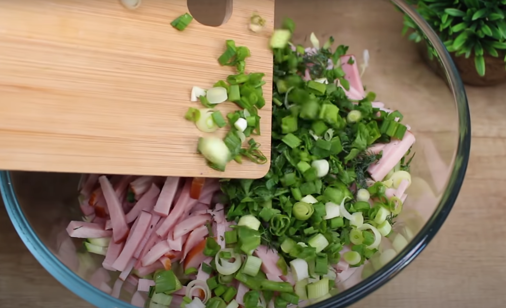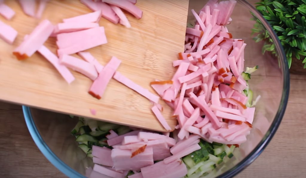 Do większej miski włóż ogórki i kapustę. Szynkę kroimy na mniejsze paski. Dodaj do miski z ogórkami i kapustą.