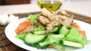 Pokrój mięso na małe kawałki. Przygotuj marynatę z czosnku i sosu sojowego. Po włożeniu mięsa do marynaty smaż je przez około dwadzieścia minut, aż nabierze pięknego, złotego koloru. Wziąć sałatę i umyć ją. Pokroić pomidora i ogórka na małe kawałki. Wszystkie składniki umieścić w misce. Doprawić solą, pieprzem i oliwą z oliwek. Sałatka jest gotowa do spożycia.