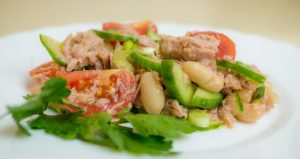 Umyj ogórki i pomidory, a następnie pokrój je na małe kawałki. Umieść fasolę w dużej misce. Połączyć fasolę z pomidorami i ogórkami. Dodać tuńczyka, rozdrabniając go widelcem. Zrobić krążki z cebuli i udekorować sałatkę. Sałatkę doprawić solą, pieprzem i oliwą z oliwek. Włoszczyzna). Smacznego!