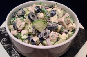Zetrzyj jabłka na tarce o małych oczkach lub drobno je posiekaj. Pokrój ogórki w plasterki. Pierś z kurczaka pokroić na małe kawałki. Oliwki przekroić na pół. Wymieszaj wszystkie składniki i dodaj jogurt, sól i pieprz. Gotowe.