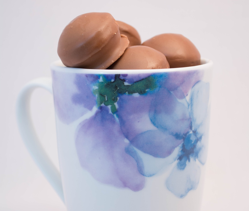 Koła moczymy w roztopionej czekoladzie tak, aby pokryły całą powierzchnię. Odstawić, aż czekolada stwardnieje. Możemy podawać słodkości.