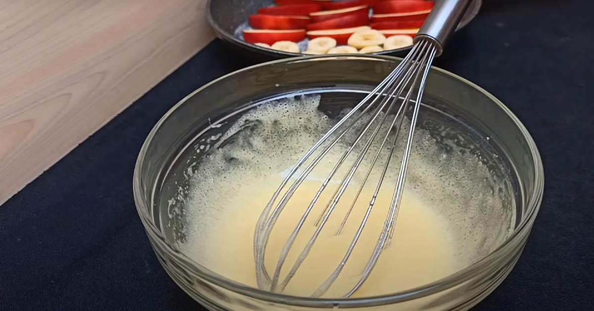 1 jabłko i 1 banan, zalewam ciastem i czekam 20 minut. Pyszna leniwa szarlotka bananowa na stole
