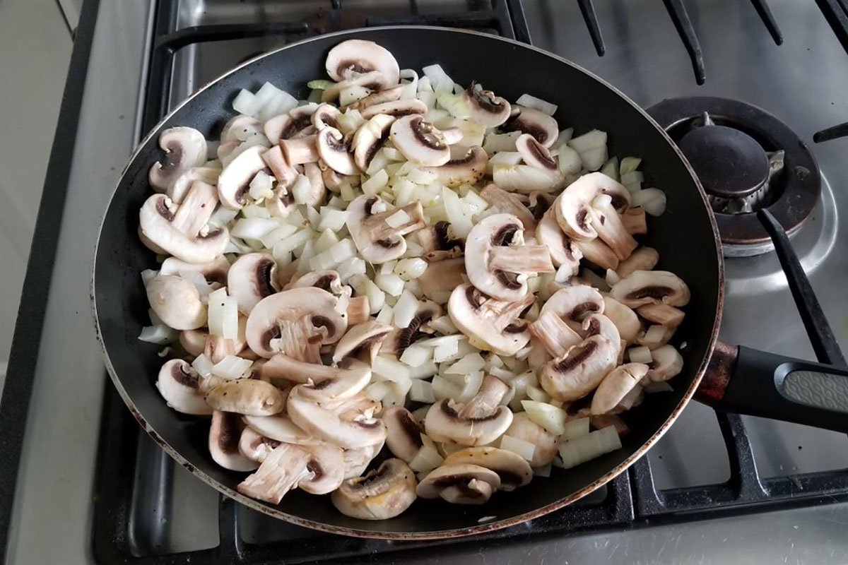 Piecz przez 40 minut w 200 stopniach. W tym czasie przygotuj sos grzybowy. Aby to zrobić, posiekaj pieczarki i cebulę. Podsmaż na patelni, dodając do smaku sól, pieprz, oregano i bazylię. Następnie wlej śmietanę i gotuj przez kilka minut.