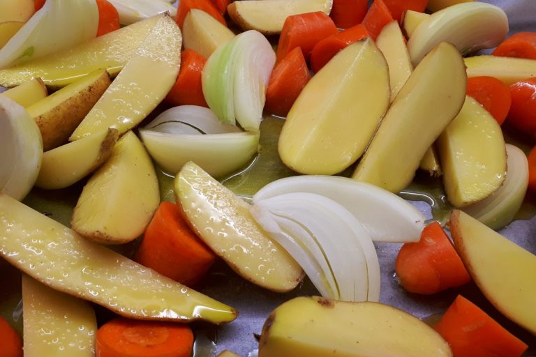 Piersi z kurczaka kroimy wzdłuż na pół. Rozłóż na blacie, przykryj folią spożywczą i postukaj tłuczkiem do mięsa. Następnie posyp je solą i czarnym mielonym pieprzem. Rozłóż ziemniaki na blasze wyłożonej papierem do pieczenia (możemy też dodać inne warzywa, np. kawałki oczyszczonej marchewki, cukinii itp.). Następnie posyp paskami cebuli.